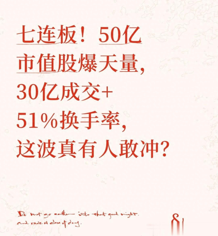 A股市场从不缺妖股,但这只票的疯狂程度,还是让人忍不住多看两眼——市值仅50亿,单日成交量却冲到30.19亿,换手率飙至51.23%,硬生生拉出七连板,短期股价涨幅高达126%,直接翻倍还多。这样的走势,在当下的市场环境里,堪称是“现象级”的存在,也让无数投资者的目光聚焦于此,有人眼红羡慕,有人胆战心惊,更有人忍不住跃跃欲试,想要进场分一杯羹。